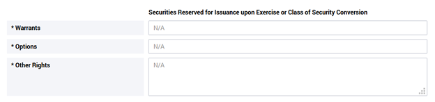 If the company has any Warrants, Options or Other Rights either attached to the securities described in the previous section or independently issued, they should be described here. If the company does not need these fields, type N/A into the fields to signify the fields are not applicable.